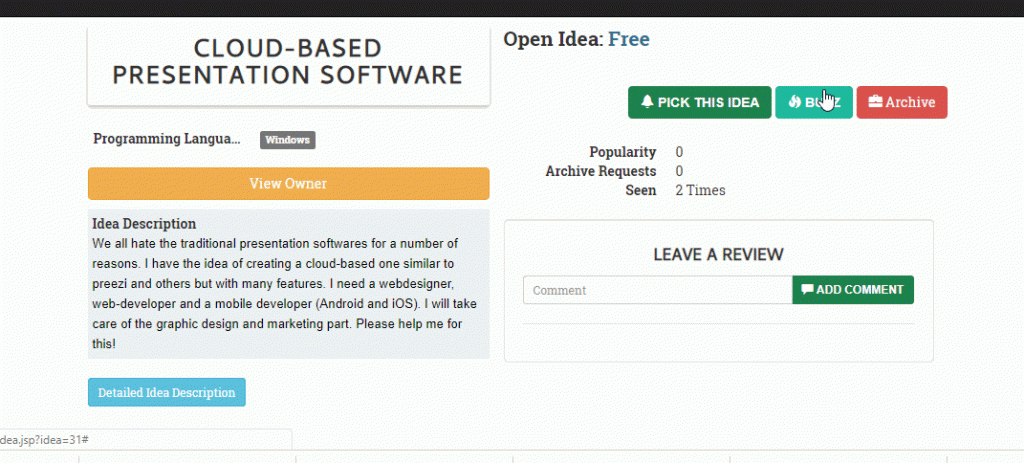 Other users will be allowed to comment alternative solutions for these ideas and request to remove the idea from website. A level 1 idea entry will be archived at the request of the owner or upon reaching a pre-defined number of archive requests. The ideas that offer a price for being developed will not have the capability of being archived until owner requests due to the unpredictability of service satisfaction. This method will also secure an opportunity for a potential developer who is willing to develop it for the specified price.